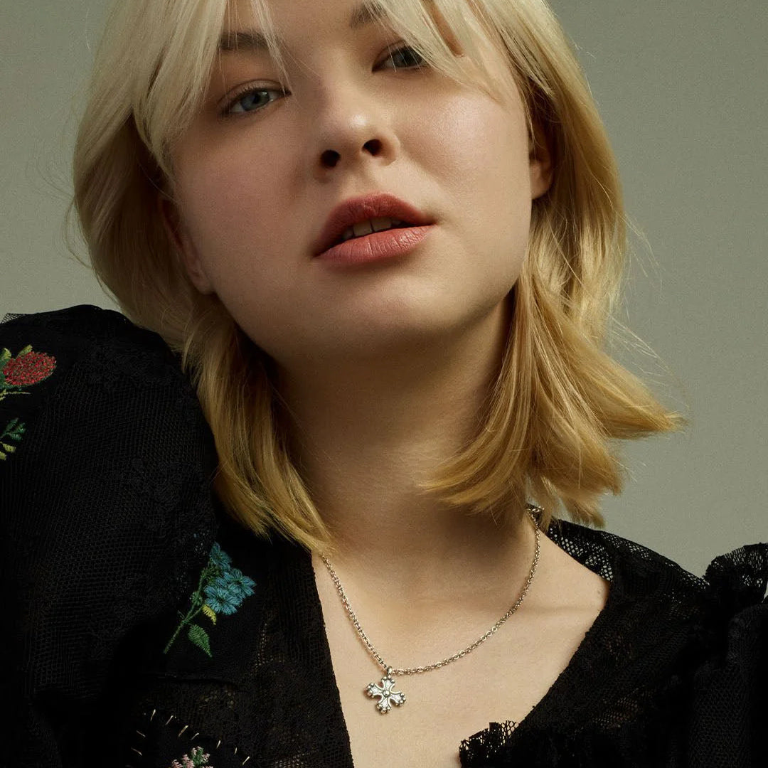 Close-up of a person with blonde hair wearing a black jacket with floral embroidery and a necklace.