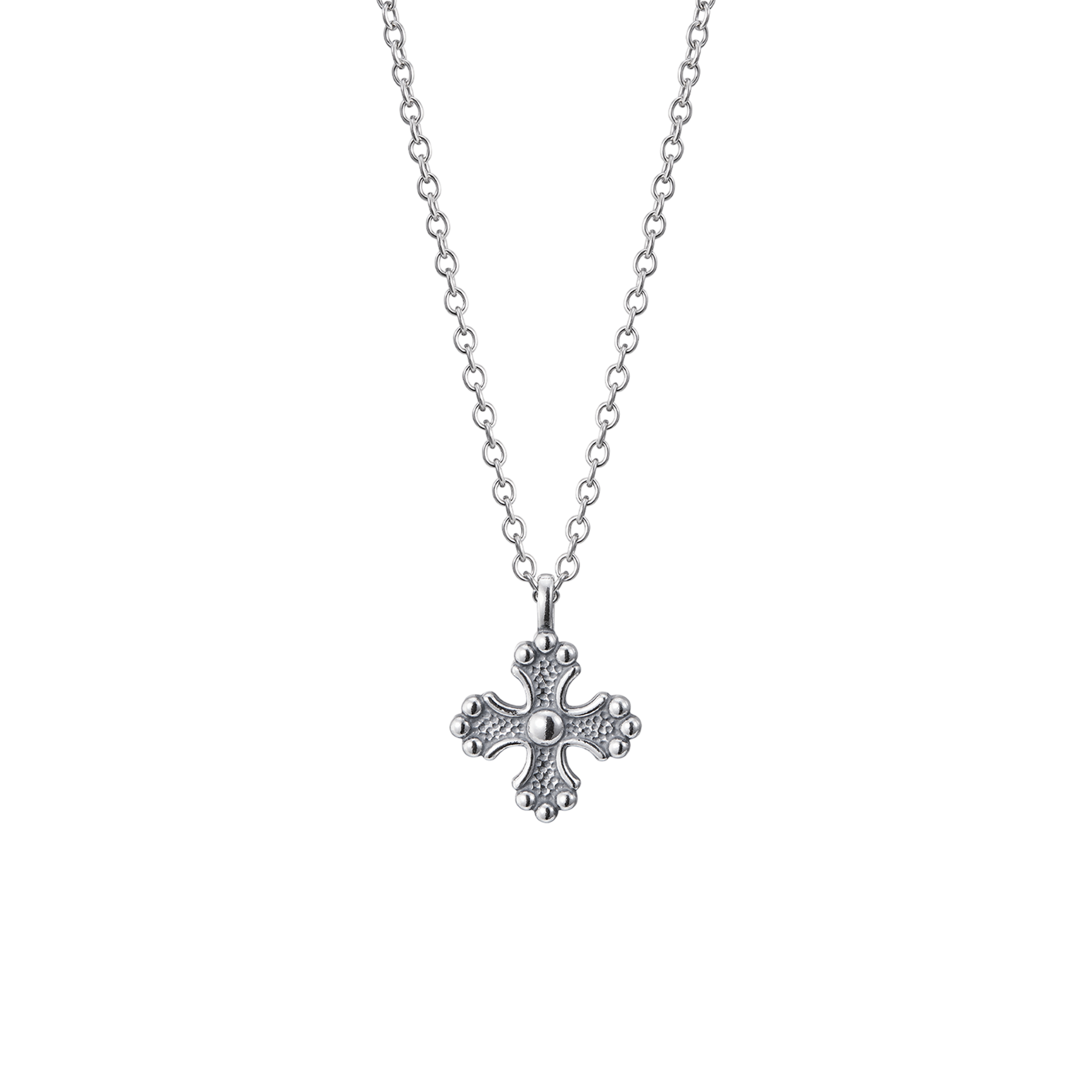 A piece of history you can wear, the Kaukola Cross silver necklace carries a design that traces back to the 14th century. Its softly textured surface and balanced proportions give it a quiet, timeless presence. Handcrafted in Finland from sterling silver, the cross hangs from an adjustable anchor chain that suits everyday wear for any age. Finished with a secure spring ring clasp, this necklace blends ancient symbolism with modern simplicity, making it a meaningful keepsake for years to come.
