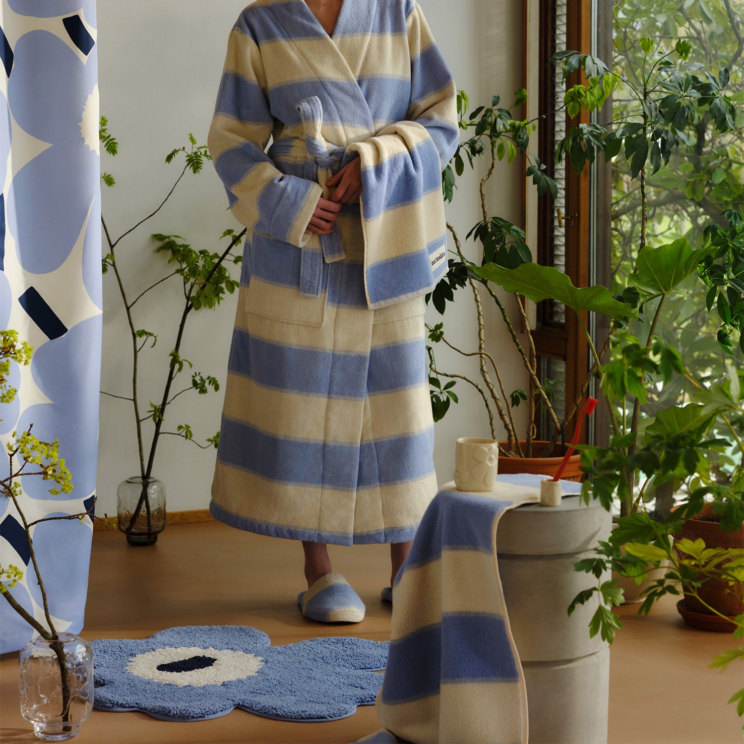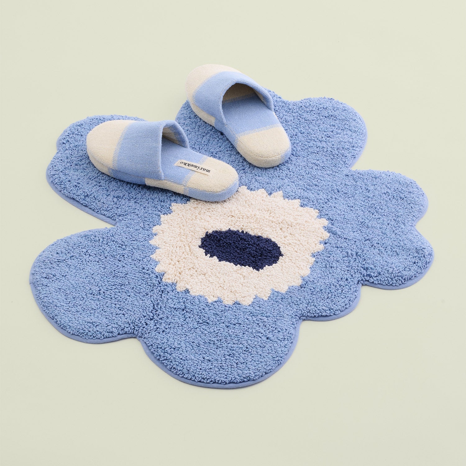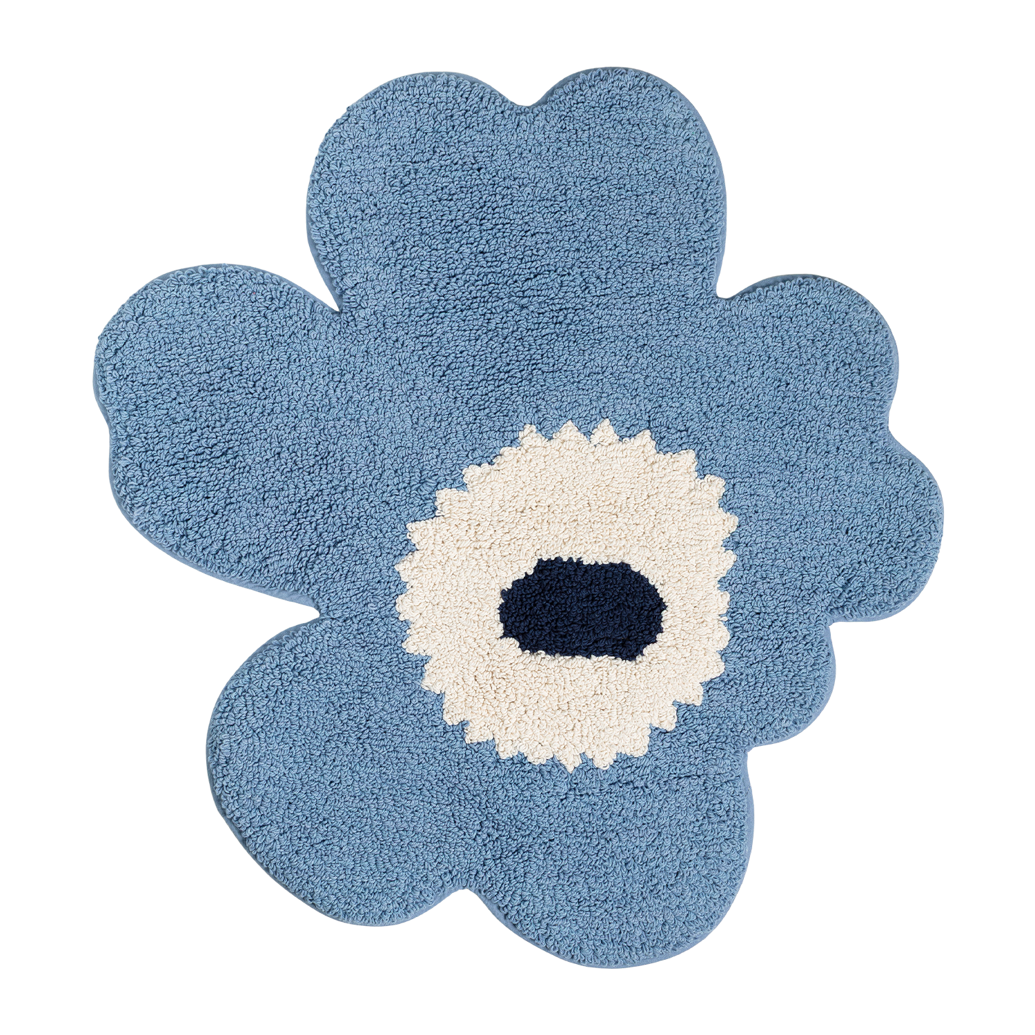 A cool, calming palette highlights one of Marimekko’s most enduring design icons. This Unikko bath mat features Maija Isola’s 1964 floral in soft light blue with off-white and navy accents, bringing a sense of balance and quiet character to the bathroom. Made from 100% organic cotton, the plush tufted surface feels comfortable underfoot, while the hand-cut flower shape ensures each piece has its own subtle individuality. A non-slip backing adds everyday stability.