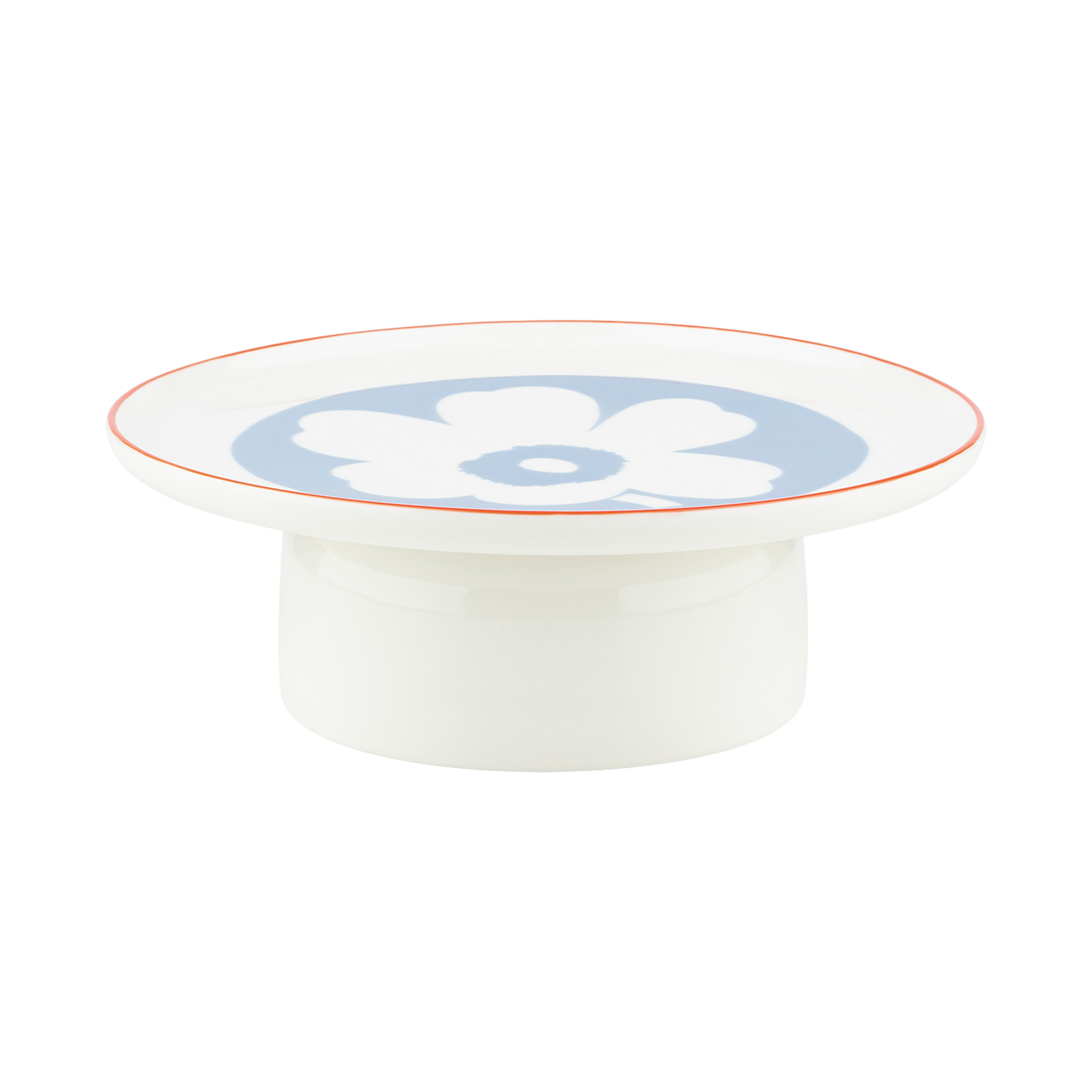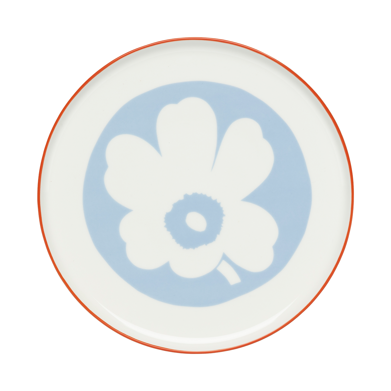 A soft light blue Unikko flower set against crisp white stoneware and finished with a hand-painted orange-red rim gives this Marimekko Unikko Serving Platter a striking yet refined presence on the table. Designed by Maija Isola in 1964, Unikko was a bold departure from Marimekko’s abstract roots and has since become an enduring symbol of creativity and confident design. The gently upturned rim adds both visual interest and practical function, making this platter ideal for serving pastries, appetizers, or shared dishes. Crafted from white stoneware and recommended for hand washing, it’s a distinctive piece meant to elevate everyday gatherings and special occasions alike.
