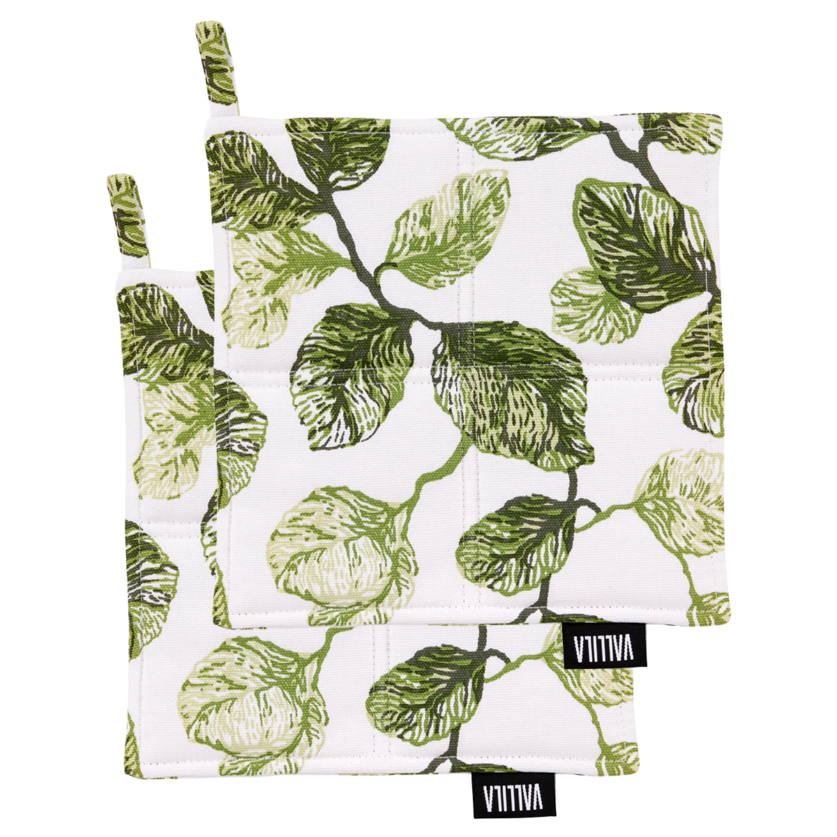 Fresh and full of life, the Vallila Alkulähde Pot Holder Set brings a touch of Finnish nature right into your kitchen. The name Alkulähde — “Origin” — hints at pure beginnings and calm, earthy beauty. Woven from 100% cotton with a thick, heat-insulating polyester lining, these potholders are as practical as they are lovely. The rich green pattern feels timeless yet modern, perfectly suited for everyday cooking or special dinners alike. Each piece includes a handy hanging loop for easy storage — and like all Vallila textiles, they blend Finnish craftsmanship with enduring quality and charm.