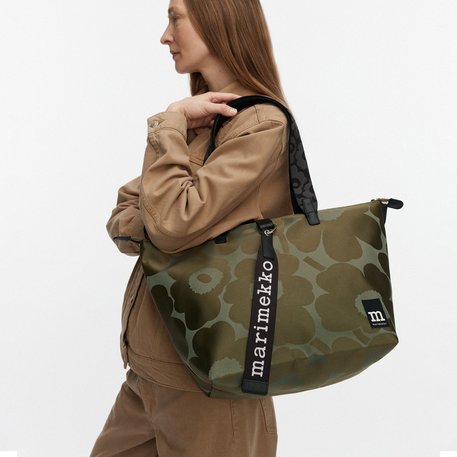 A timeless Marimekko classic meets everyday practicality in this Unikko Medium Shoulder Tote Bag. The iconic Pieni Unikko pattern, designed by Maija Isola, appears here in rich green tones that feel grounded, modern, and easy to wear year-round. The structured silhouette offers generous space for daily essentials—and comfortably fits a laptop—while a zippered top keeps everything secure. Made from recycled materials with subtle leather details, this tote balances sustainability with durability. Thoughtful finishes like the interior slip pocket and signature logo keystrap make it a reliable companion for workdays, errands, and weekend outings alike.