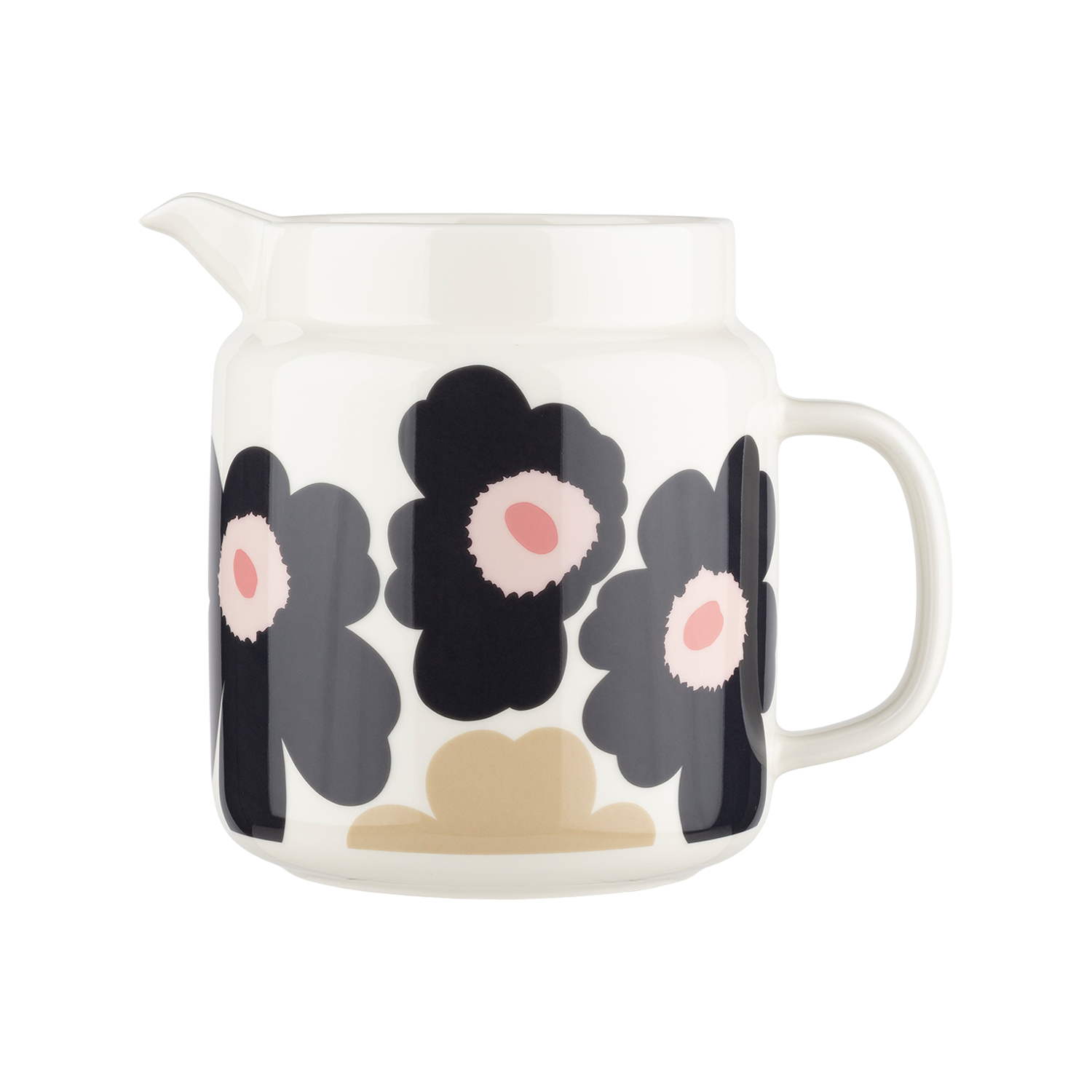 A practical, beautifully proportioned jug that brings Marimekko’s most iconic pattern into everyday use. Featuring Maija Isola’s Unikko design from 1964, the bold florals in charcoal, sand, and soft pink add warmth and character to the clean white stoneware. With a 1.5-liter capacity, it’s well suited for serving water, juice, milk, or even gravy at the table without feeling bulky. The sturdy handle and balanced shape make pouring easy, while the durable stoneware is safe for the oven, microwave, freezer, and dishwasher. A timeless piece designed to be used daily, not just admired.