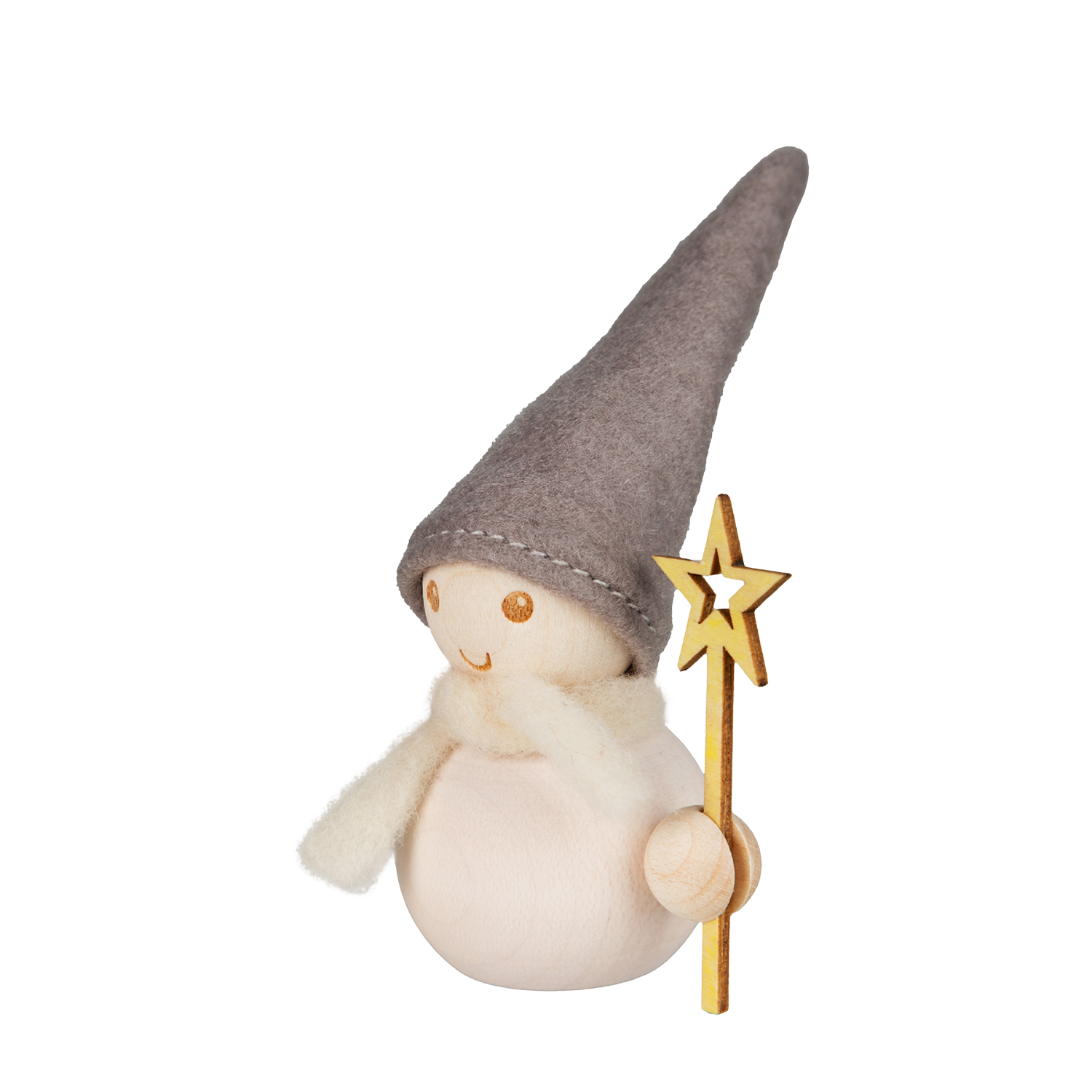 Decorative figure of a snowman with a gray hat and gold star wand on a white background