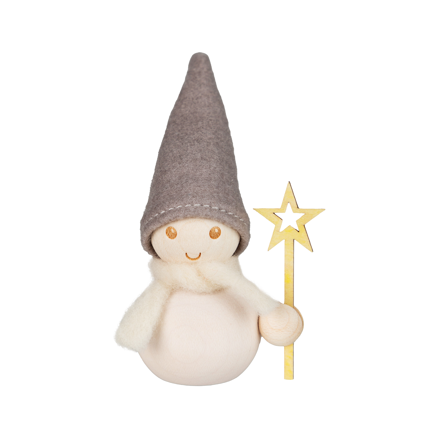 Soft winter light seems to follow wherever this little one goes. The Aarikka Frost Tonttu – Star-bearer holds a golden star close, a gentle symbol of warmth in the Finnish winter. Handcrafted with smooth maple beads and dressed in cozy felt and merino wool, this white-and-grey tonttu embodies Aarikka’s signature blend of simplicity and charm. Handmade in Finland, it’s a timeless keepsake—perfect for brightening a table, windowsill, or gifting to someone who treasures Nordic craftsmanship and quiet, wintry beauty.