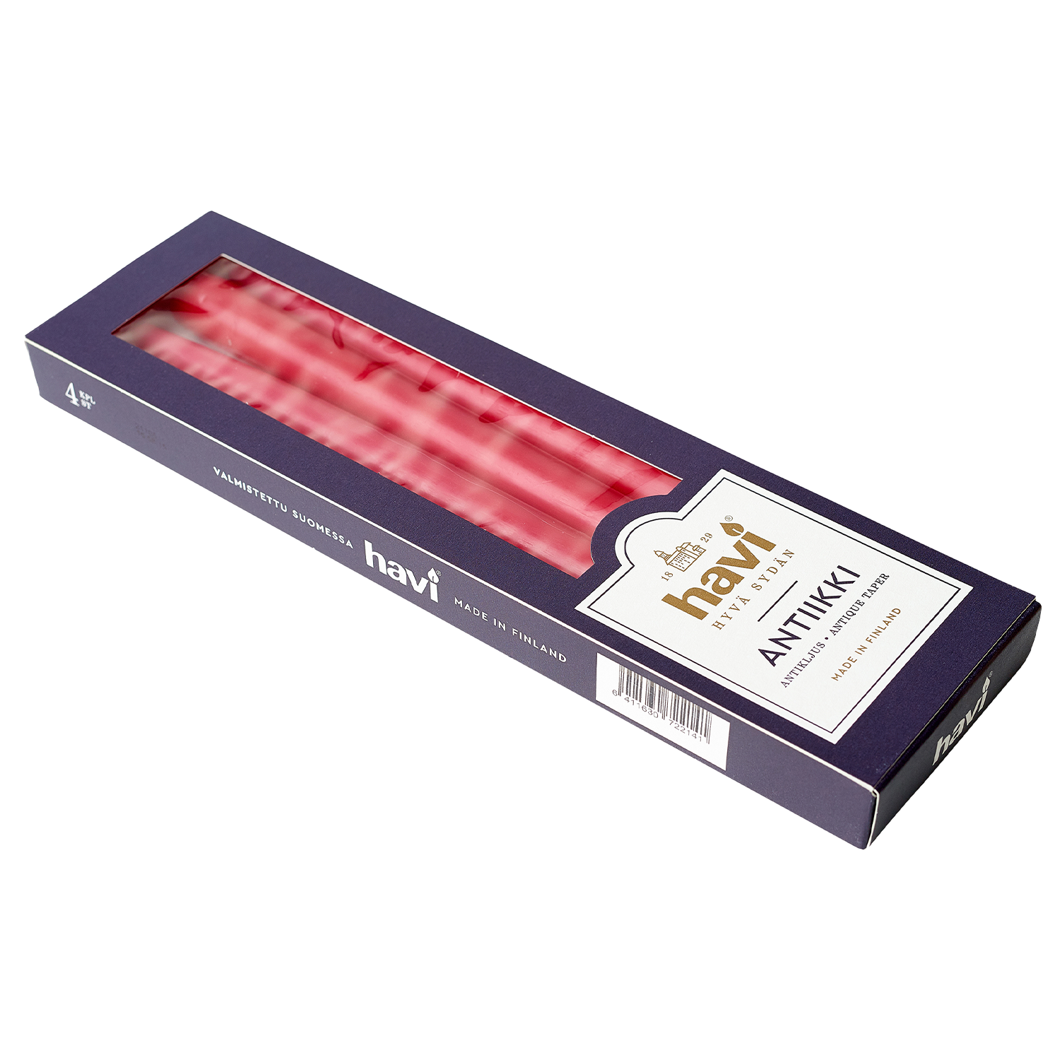 Havi’s burgundy antique taper candles bring a classic touch to any table or décor. Crafted from clean-burning stearin, each candle provides up to 8 hours of warm, steady light. The elegant proportions and timeless white hue make them versatile for everyday use or special occasions. Made in Riihimäki, Finland by Havi, a family company with nearly two centuries of candle-making expertise. Comes in a convenient 4-pack box.