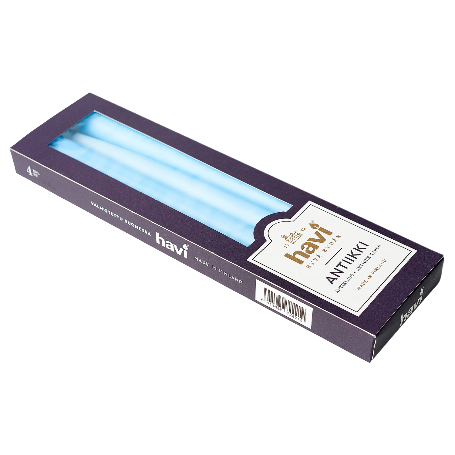 Havi’s light blue antique taper candles bring a classic touch to any table or décor. Crafted from clean-burning stearin, each candle provides up to 8 hours of warm, steady light. The elegant proportions and timeless white hue make them versatile for everyday use or special occasions. Made in Riihimäki, Finland by Havi, a family company with nearly two centuries of candle-making expertise. Comes in a convenient 4-pack box.