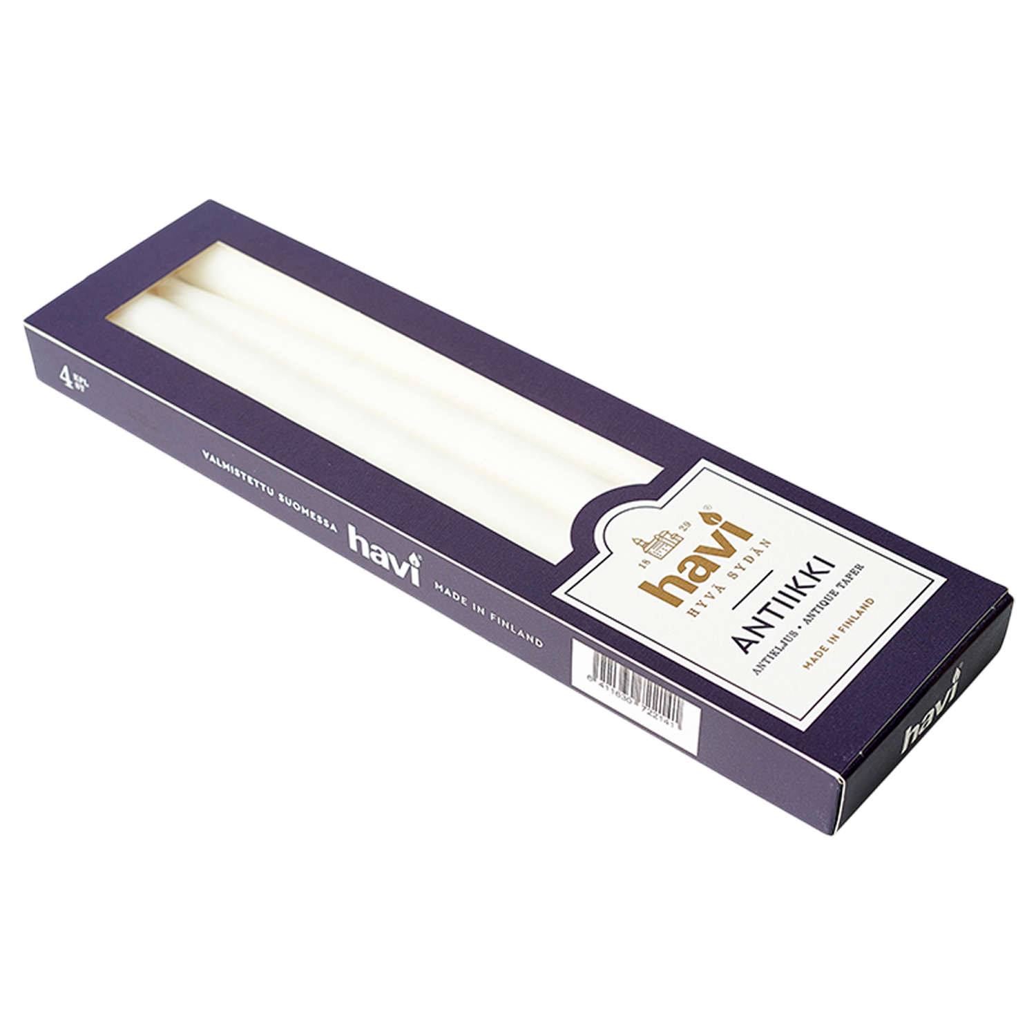 Havi’s white antique taper candles bring a classic touch to any table or décor. Crafted from clean-burning stearin, each candle provides up to 8 hours of warm, steady light. The elegant proportions and timeless white hue make them versatile for everyday use or special occasions. Made in Riihimäki, Finland by Havi, a family company with nearly two centuries of candle-making expertise. Comes in a convenient 4-pack box.