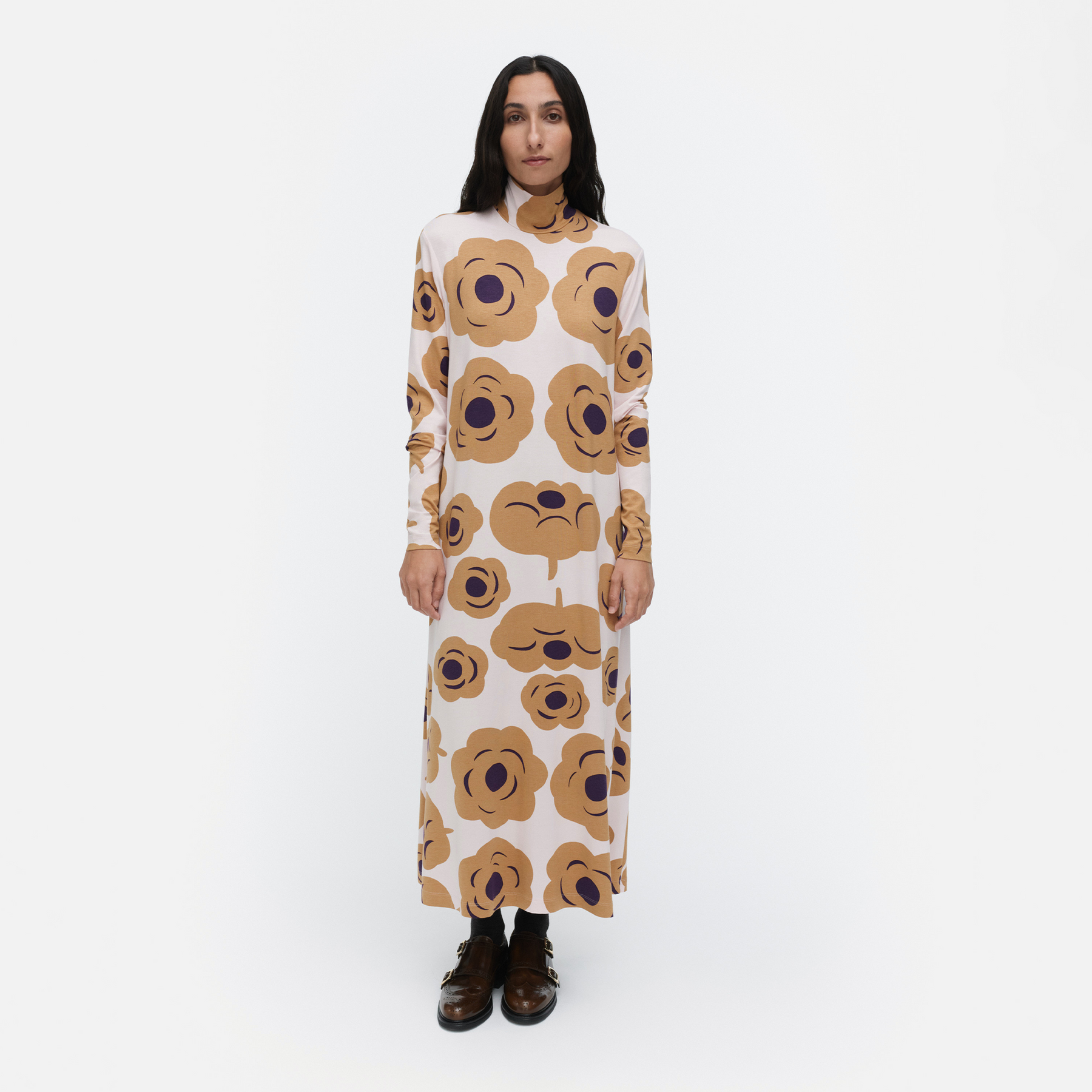 Elegant yet effortlessly wearable, the Cavea Tumma jersey dress brings a touch of Finnish design heritage to your wardrobe. Its slim fit at the shoulders and chest ensures a flattering shape, while the A-line silhouette allows for ease at the waist and hips. A soft turtleneck and long sleeves add cozy coverage, and the Lenzing™ Ecovero™ viscose with a hint of stretch drapes beautifully and moves with you. The striking Tumma pattern, designed by Maija Isola in 1970 after her travels to Paris, blends light pink, brown, and dark purple for a bold yet refined floral statement—comfort and artistry in one.