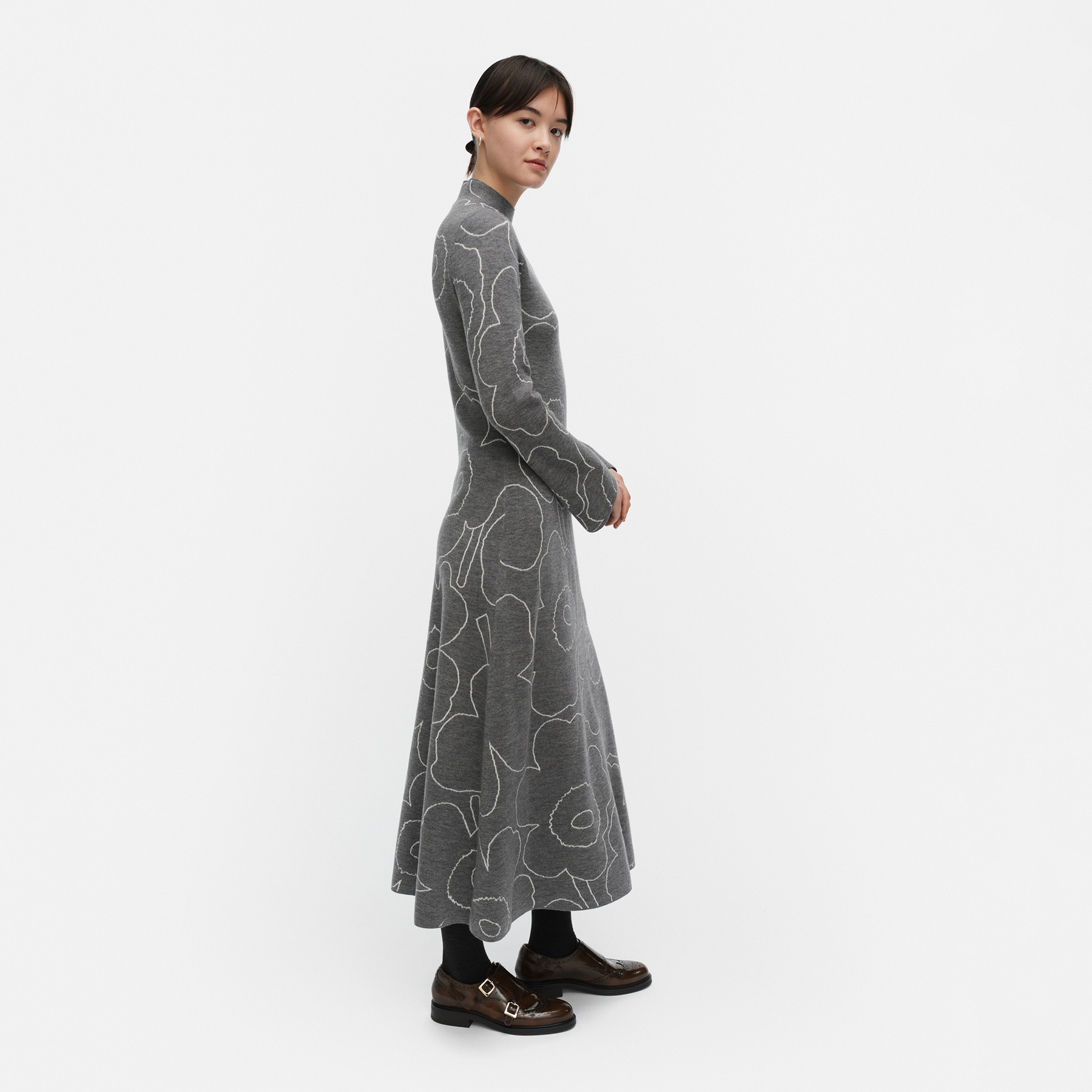 The Willat dress blends modern elegance with Marimekko’s signature artistry. Slim through the shoulders and chest, it flows into a flattering fit-and-flare silhouette with a softly flared hem. The jacquard-knit Piirto Unikko pattern—Maija Isola’s airy, minimalist take on her iconic 1964 poppy—adds quiet sophistication in dark grey and off-white. Crafted from a luxurious blend of RWS-certified merino wool and organic cotton, it offers warmth, breathability, and natural softness. Slightly flared sleeves and a raised neckline give the design an extra touch of refinement, making it a versatile piece for both everyday wear and special occasions.