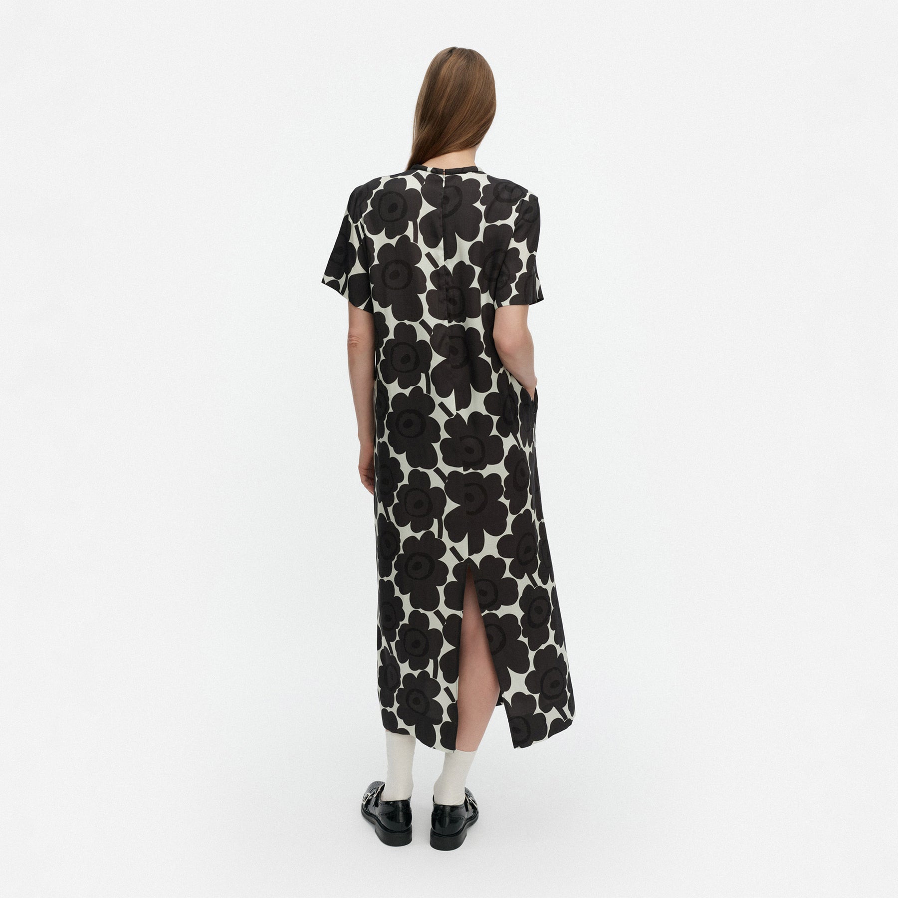 Preview Free Gift ($40 value) →There’s an understated sophistication to the Kuvaelma Dress, where Maija Isola’s Unikko flowers flow across a sleek, straight silhouette. The soft Tencel–viscose blend drapes beautifully, giving the dress a smooth, almost liquid movement as you walk. A padded neckline, hidden back zipper, and subtle bust darts create a refined fit, while forward-shifted seams hide practical side pockets. Finished with a back slit for easy stride, this is a modern t-shirt dress elevated by iconic Finnish design—light, comfortable, and effortlessly polished.