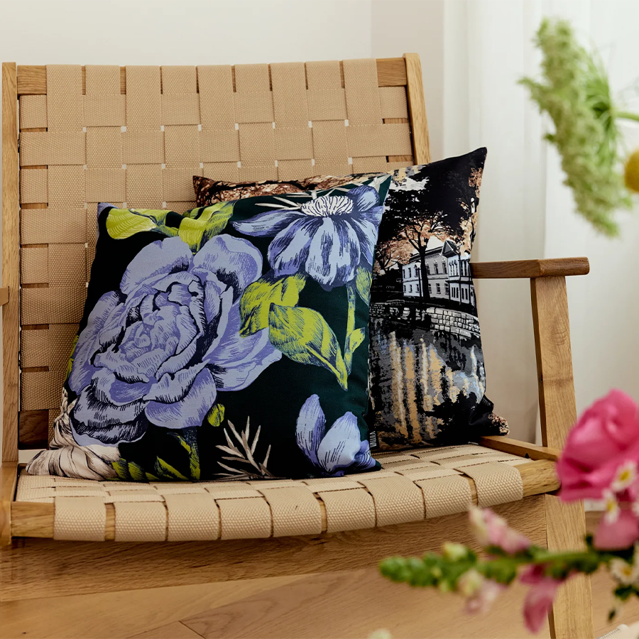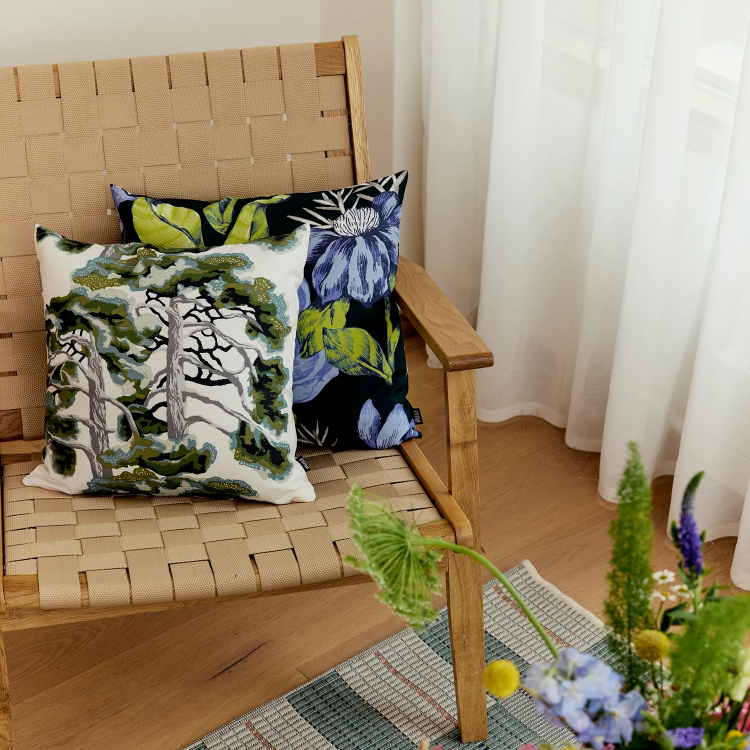 Understated yet full of character, the Vallila Lupaus Cushion Cover brings a touch of Finnish craftsmanship to your home. Designed by Saara Kurkela, the intricate floral motif is perfectly pattern-aligned and appears on both sides for a seamless look. The green and lilac tones add soft color without overwhelming your space. Made from a durable mix of 69% cotton and 31% recycled polyester, it balances comfort with sustainability. A hidden zipper closure keeps the finish tidy and practical. Use with any 43 cm (or slightly larger) insert for a full, plush shape.