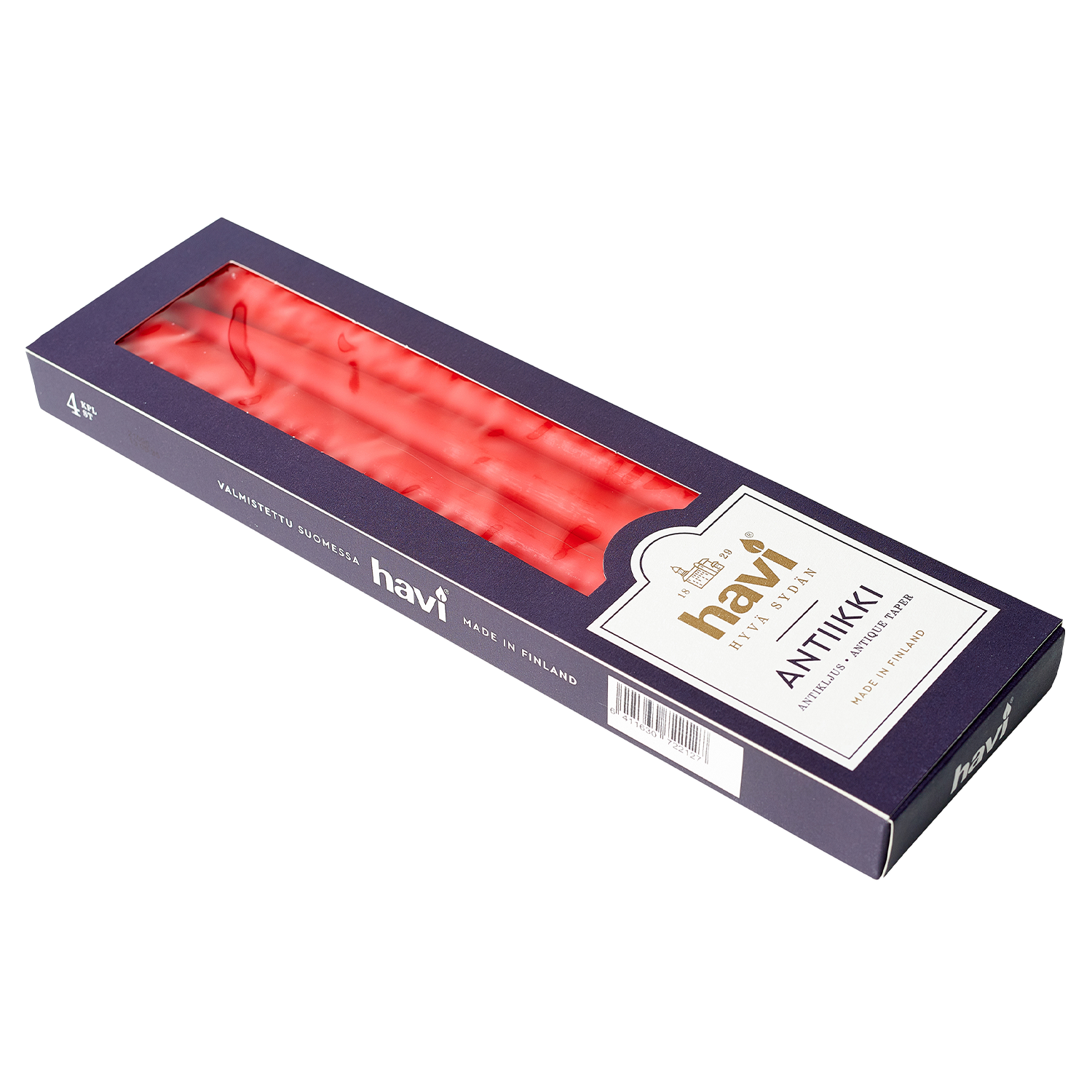 Preview Free Gift ($40 value) →Havi’s red antique taper candles bring a classic touch to any table or décor. Crafted from clean-burning stearin, each candle provides up to 8 hours of warm, steady light. The elegant proportions and timeless white hue make them versatile for everyday use or special occasions. Made in Riihimäki, Finland by Havi, a family company with nearly two centuries of candle-making expertise. Comes in a convenient 4-pack box.